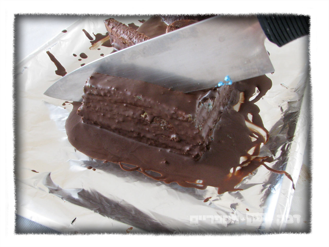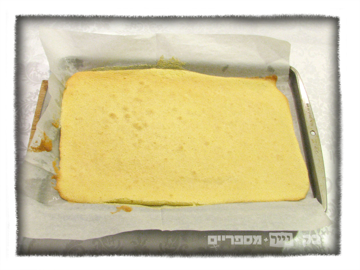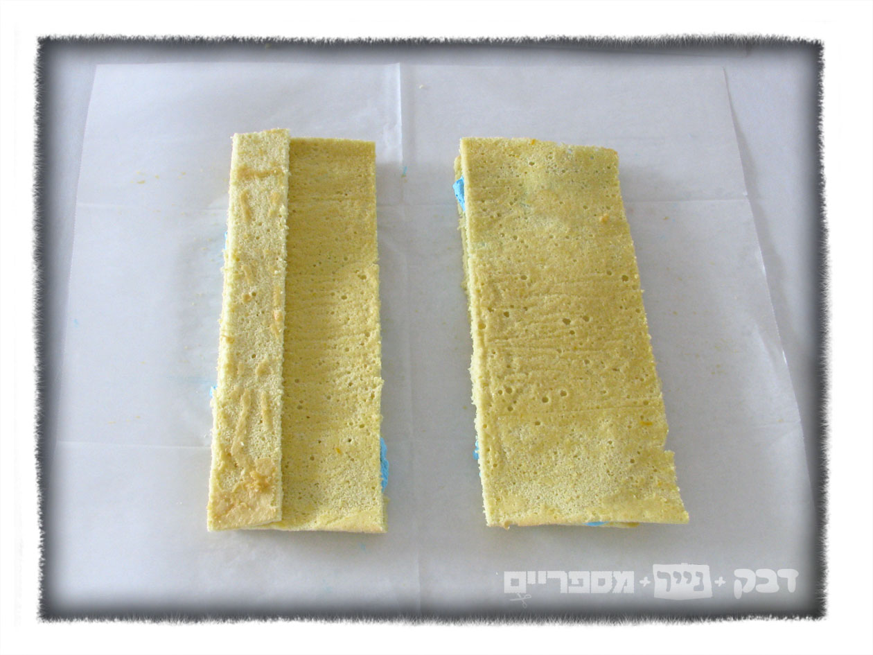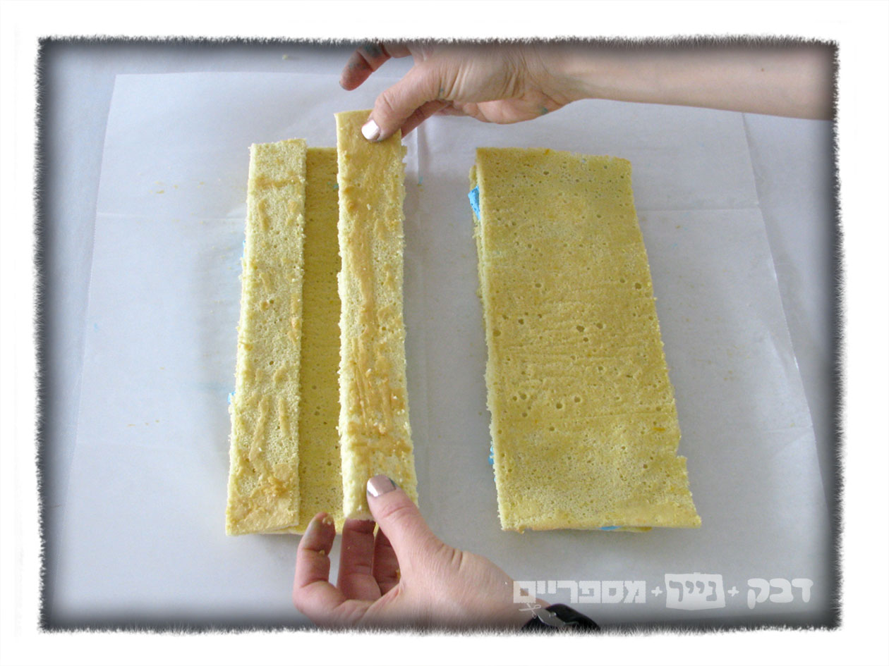 - את העוגה הראשונה חותכים לארבעה מלבנים של 9 על 25 ס"מ