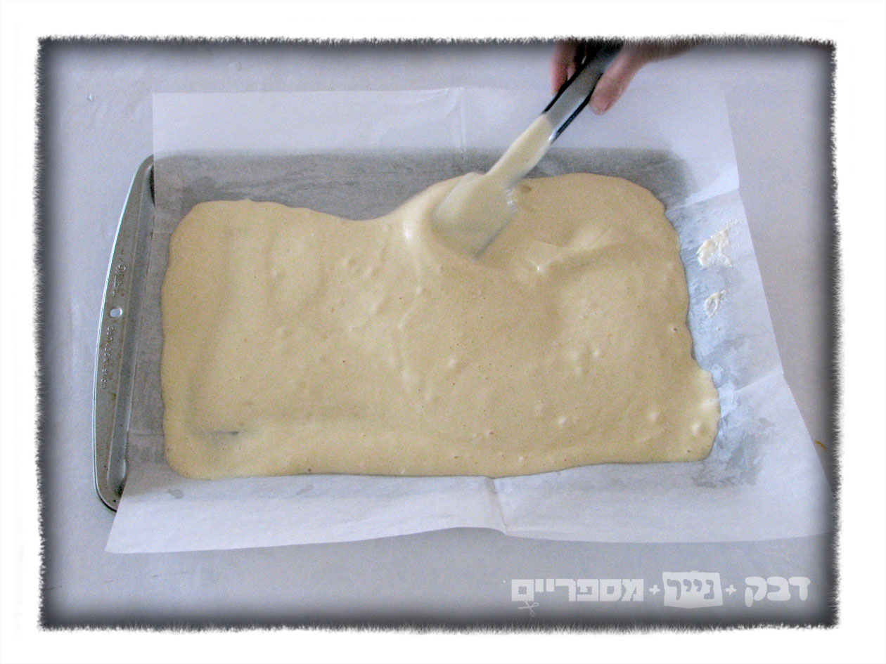 - חוזרים על התהליך עם החצי השני של הקצף (אם יש שתי תבניות ותוכנית טורבו, אפשר לאפות בו זמנית)