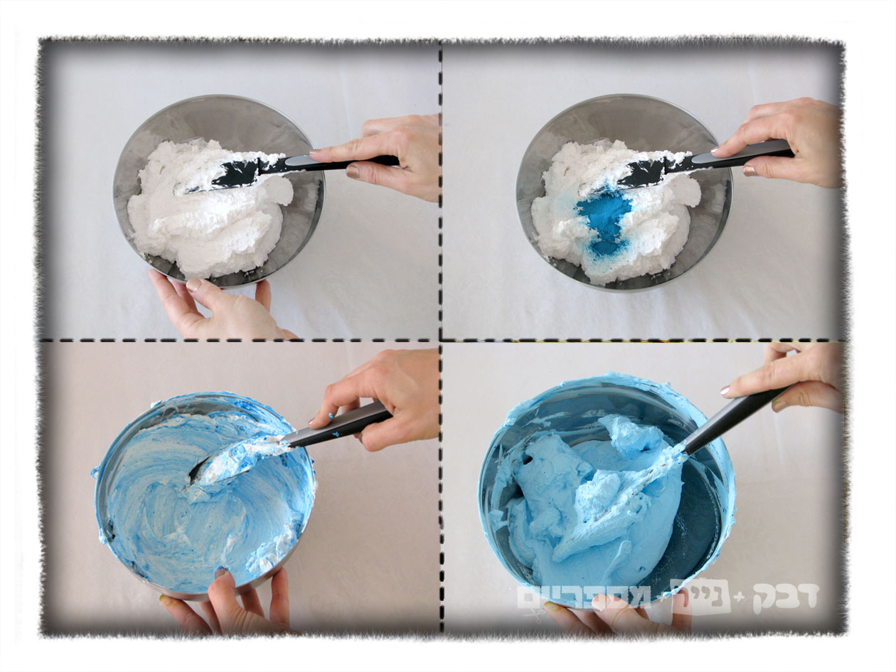 - מוסיפים מעט צבע מאכל כחול לקבלת גוון כחול רצוי, ומערבבים.