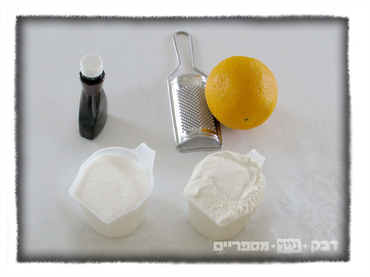 ביצים, קמח, סוכר, אבקת סוכר, וניל, קצת תפוז (אם רוצים),