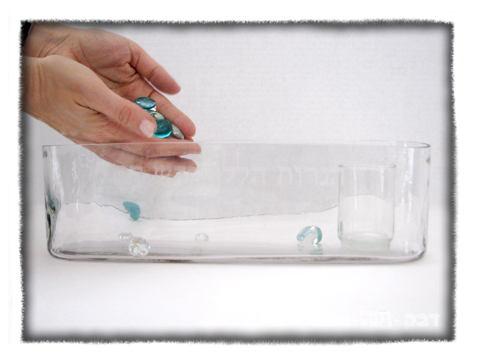וממלאה את הכלי בחלוקי זכוכית צבעוניים – –
