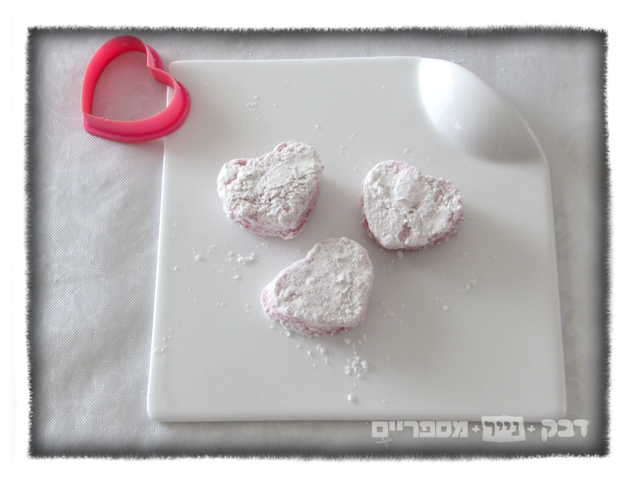 מבצע מרשמלו מספר שתיים. את המתכון של הלה קריב מהבלוג ביסים ניסיתי בהתלהבות, אך נדרש מקצה שיפורים: הוספתי צבע מאכל כדי שיהיה ורוד. לא הוספתי מלח (בפעם שעברה היו תלונות), במקום לחתוך לריבועים (משעמם, טענו הגמדים) חתכנו עם חותכן של עוגיות לצורת לבבות (רעיון יצירתי של הילדים). למרות שבפעם הראשונה צייתנו להוראות ופידרנו בהמון המון אבקת סוכר וקורנפלור (גם את הרצפה ואת היקום), המרשמלו היו במרקם של חשופית (רטוב ודביק). הפעם אחת הבנות הציעה לנסות והשאירה לב אחד לייבוש על השיש לכמה שעות. זה עשה לו מרקם קצת יותר מוכר של מרשמלו (מוגדר מבחוץ ולח מבפנים), והחלטנו לייבש את כולם לכמה שעות. מזל שאין כאן נמלים! יצא מוצלח מאוד.