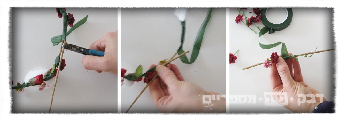 ומצמידים תוך כדי מתיחה וליפוף של הסרט הירוק סביב בסיס הפרח. הכי פשוט זה לסובב את הגבעול ולא לסובב את הסרט.