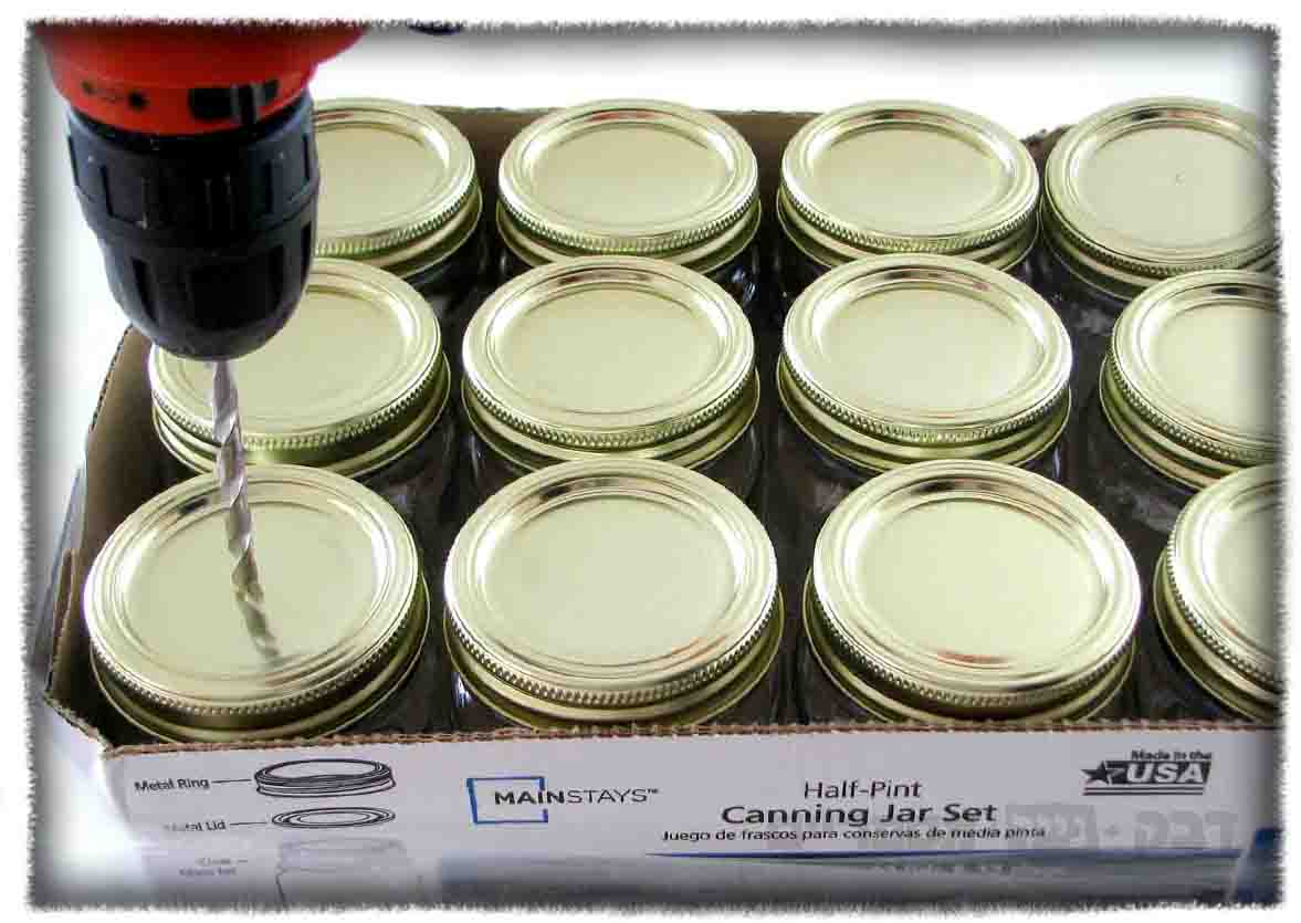 קדחנו חור ברוחב 1/2 ס"מ במרכז כל מכסה של צנצנת.