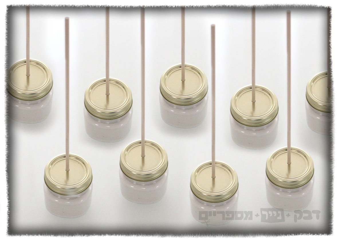 יצקנו את תערובת הגבס לצנצנות, סגרנו מייד במכסה ונעצנו את מקל העץ. התערובת מתקשה לגמרי בתוך כשעה.