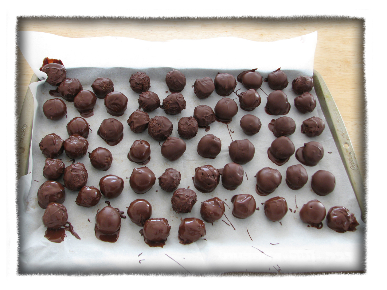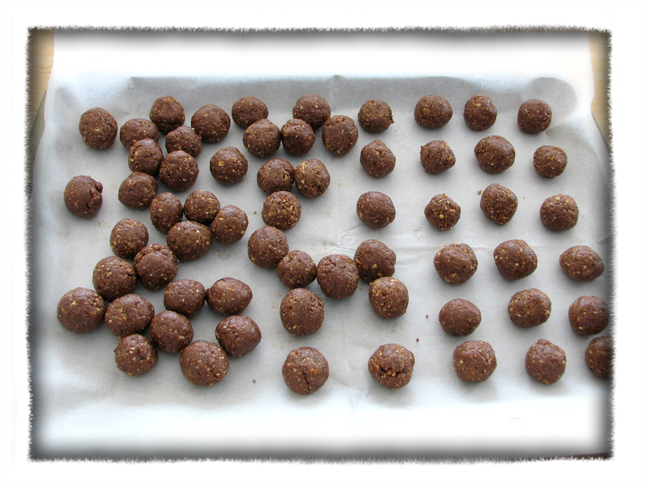 יוצרים כדורים קטנים עם ידיים רטובות, ומניחים על מגש מרופד בנייר אפיה. מניחים במקפיא לחצי שעה לפחות.